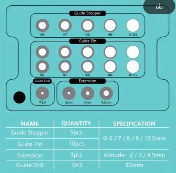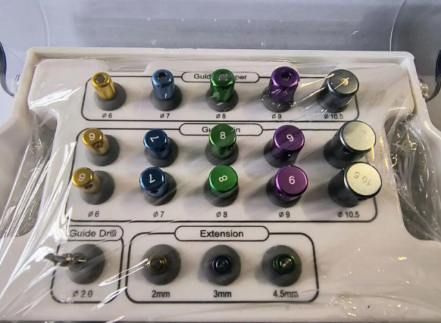Набор шаблонов и направляющих для имплантов ApogeyDental Guide Drill (Направляющие сверла): Для точного создания отверстия под имплант. Они имеют разную длину и диаметр, что обеспечивает правильное позиционирование и глубину сверления. На изображении видны сверла с диаметром Ø6, Ø7, Ø8, Ø9 и 10.5 мм.